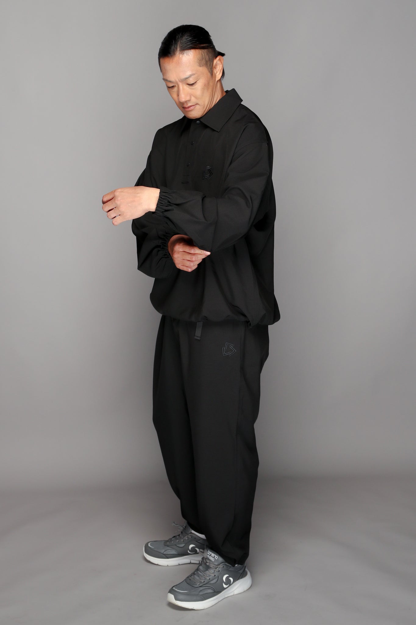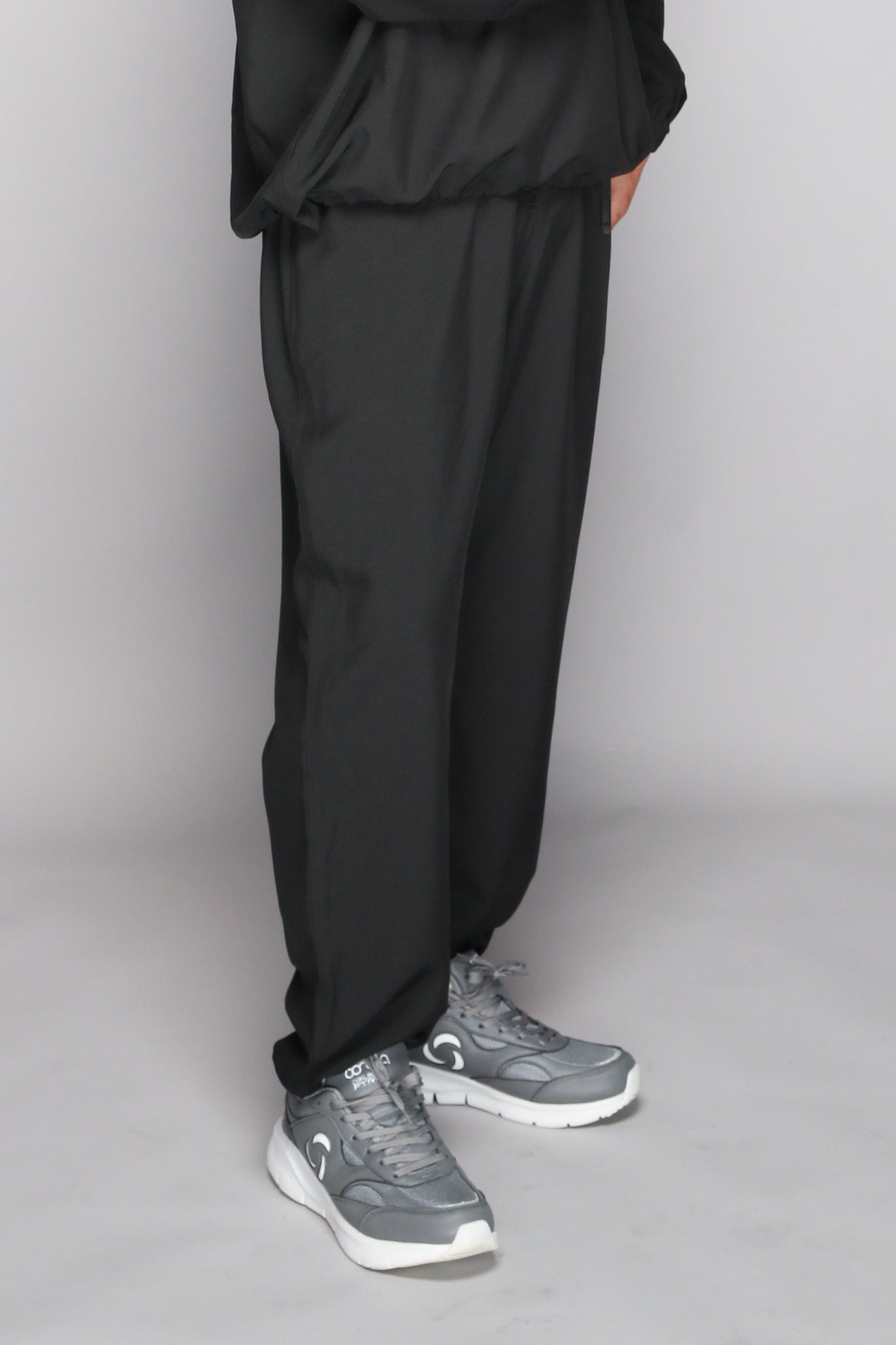 伸縮性のある素材を使用し、動きやすさとトレンド感のあるシルエットを両立。快適さとおしゃれを兼ね備えた一枚です。