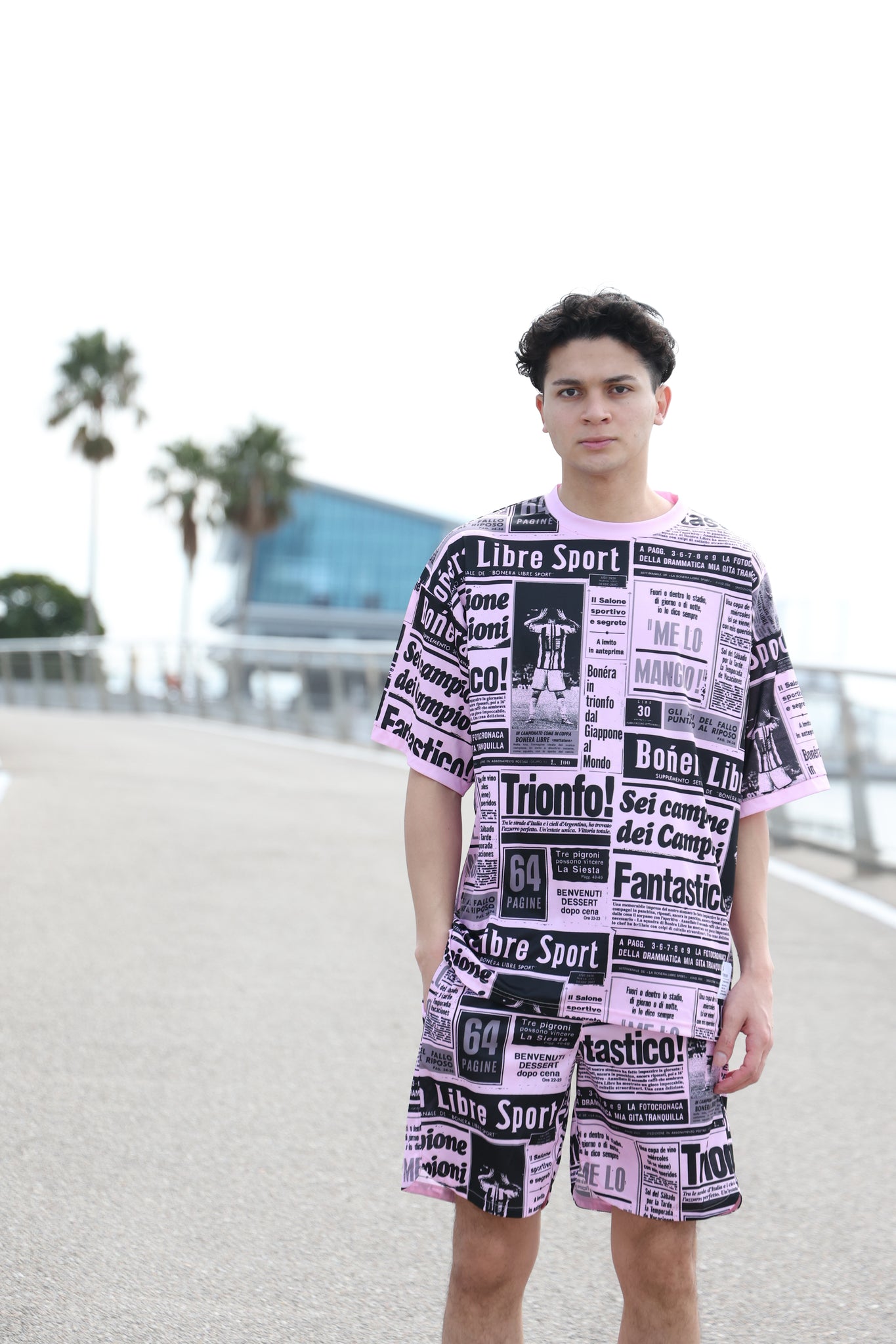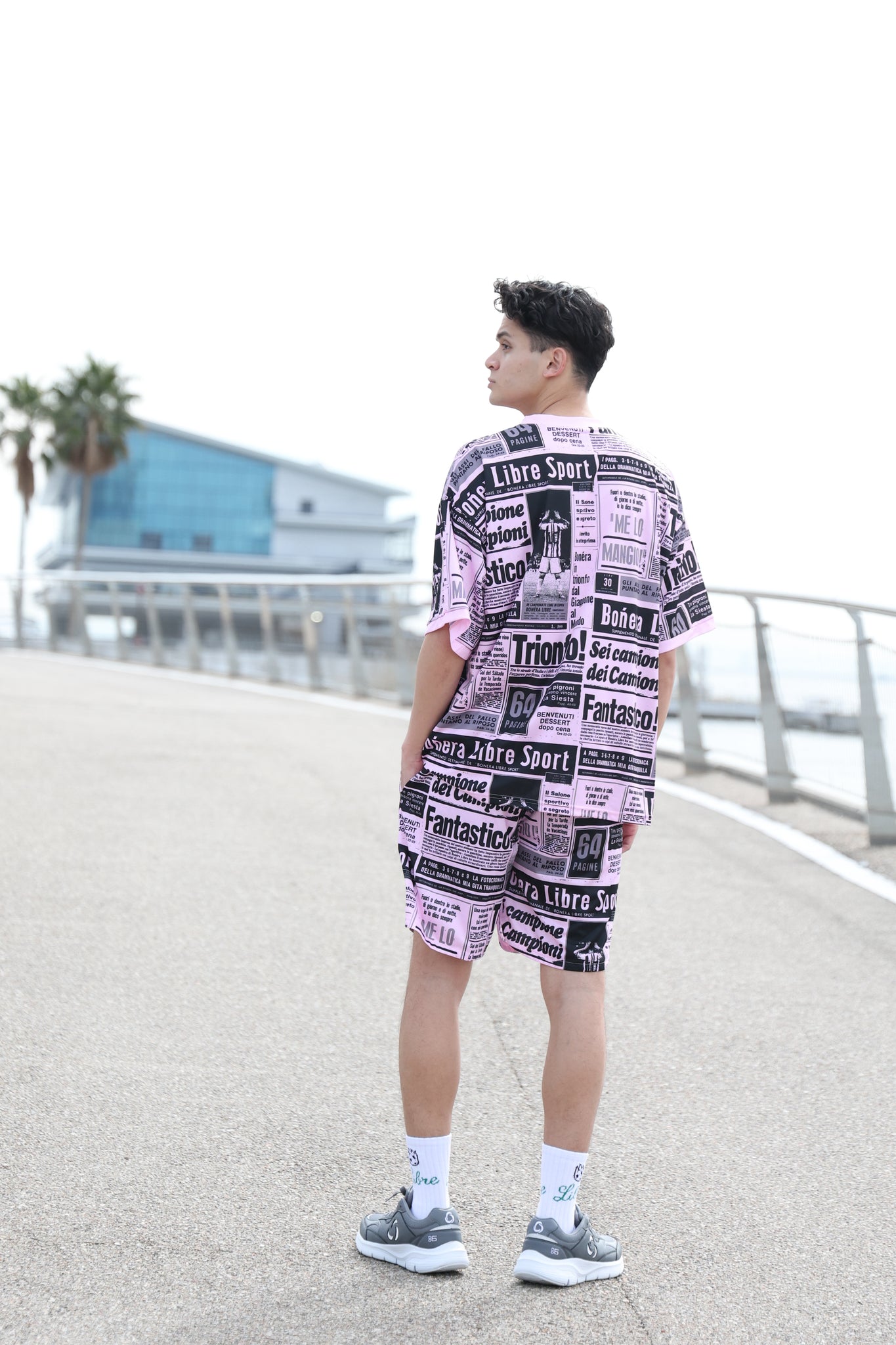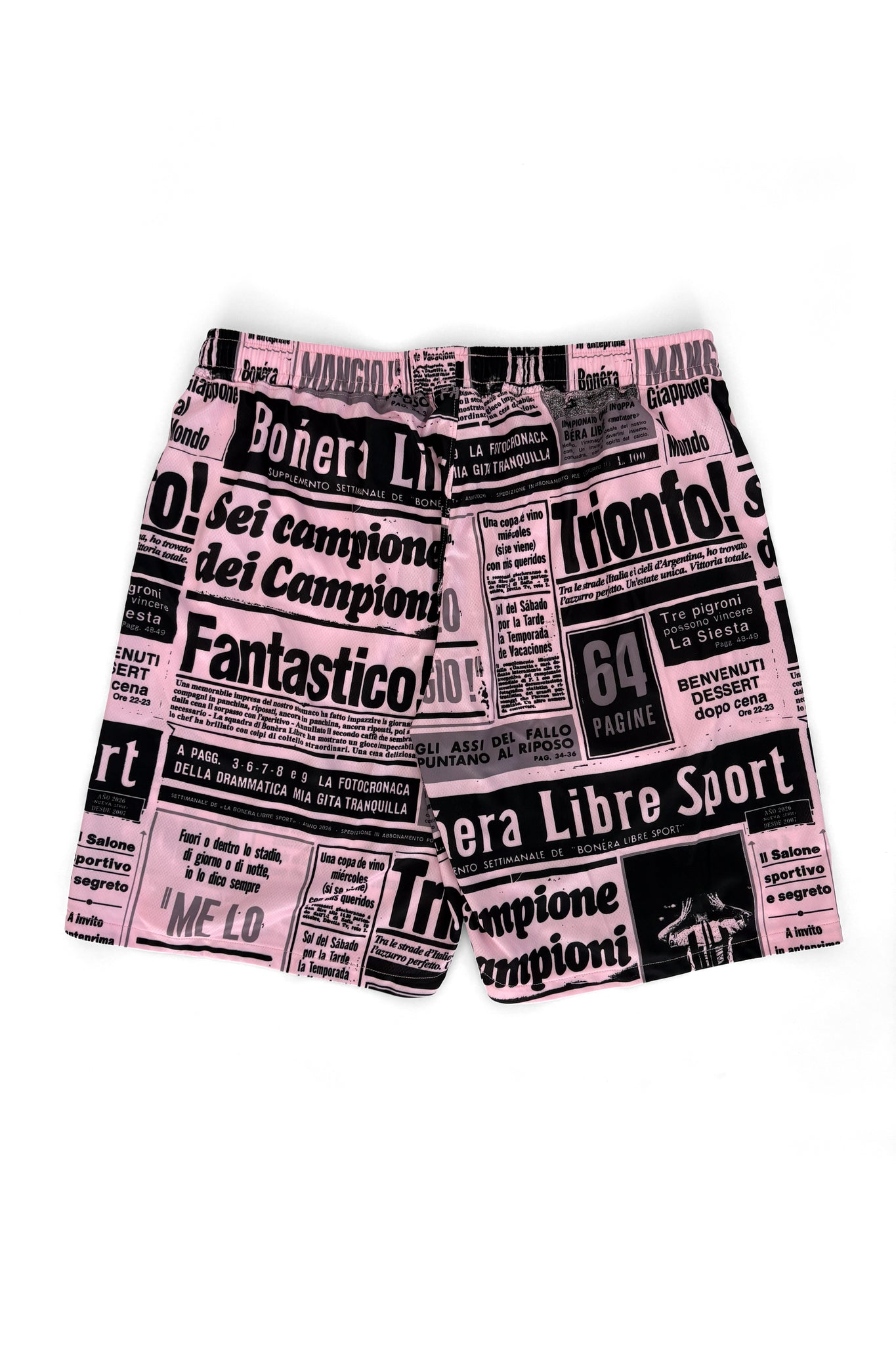 ヨーロッパのサッカータブロイド紙をモチーフにした総柄デザインのパンツ。トレンド感のあるスタイルを楽しめ、カジュアルからスポーティーまで多用途に活躍します。